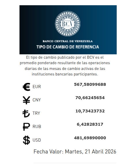 El Banco Central de Venezuela publicó en sus redes sociales al cierre de la jornada de este lunes 20 de abril de 2026, el dólar se cotizará en 481,69 bolívares con fecha valor martes 21 de abril de 2026.
