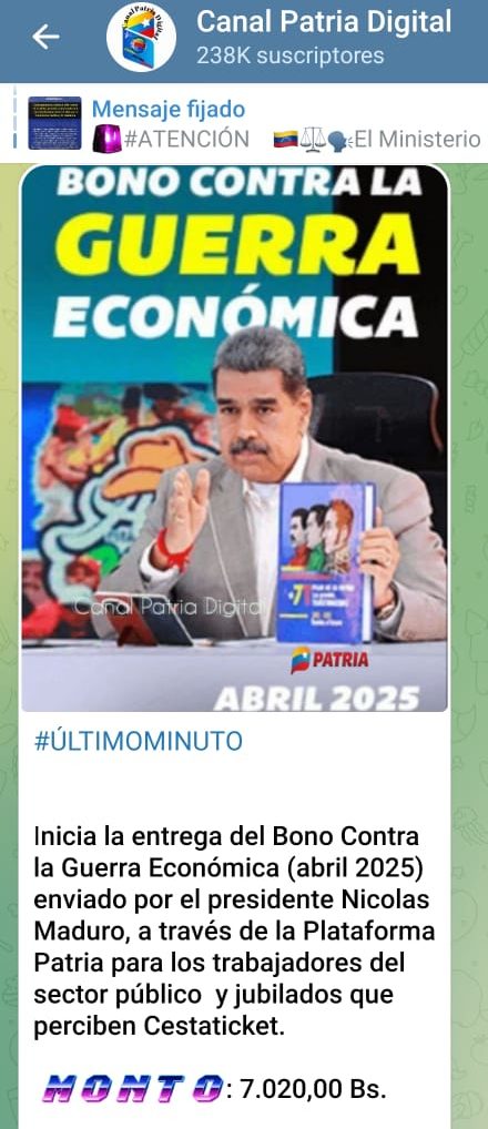 «Monedero Patria: Crédito por Bs. 7.020 por concepto de bono Contra la Guerra Económica (abril de 2025)», precisa el mensaje que reciben los beneficiarios.