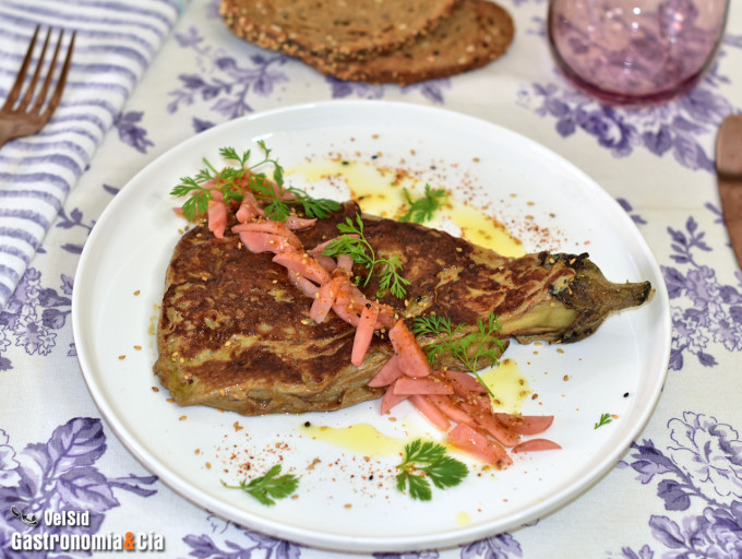 La tortilla de berenjena se suele servir con arroz blanco y ketchup. Pero también la puedes disfrutar sola, con un poco de cilantro, sésamo, chile, rabanitos encurtidos (ver receta) y un hilo de aceite de oliva virgen extra. El resto es comer y disfrutar. ¡Buena cocina y buen provecho!
